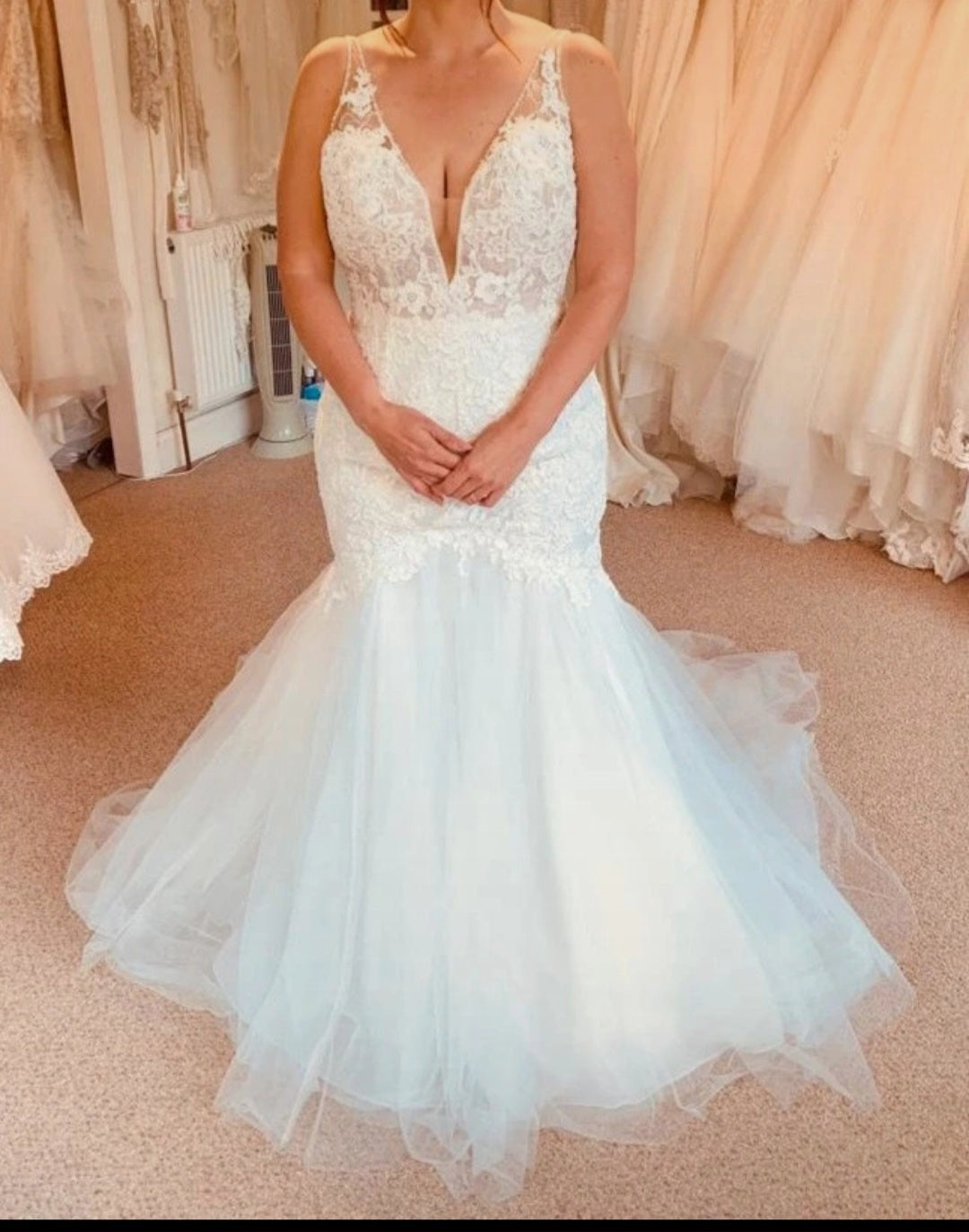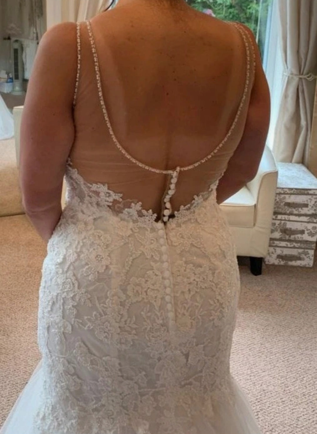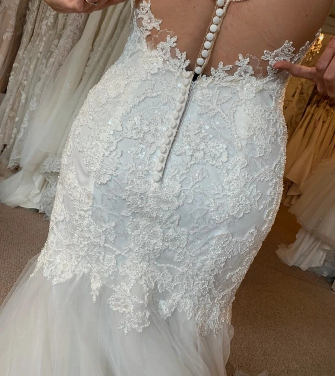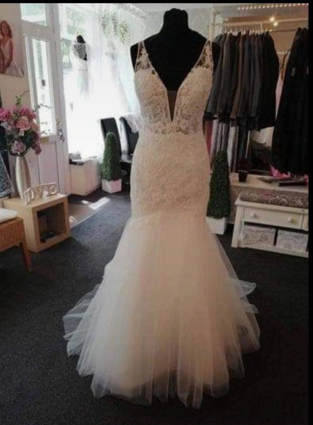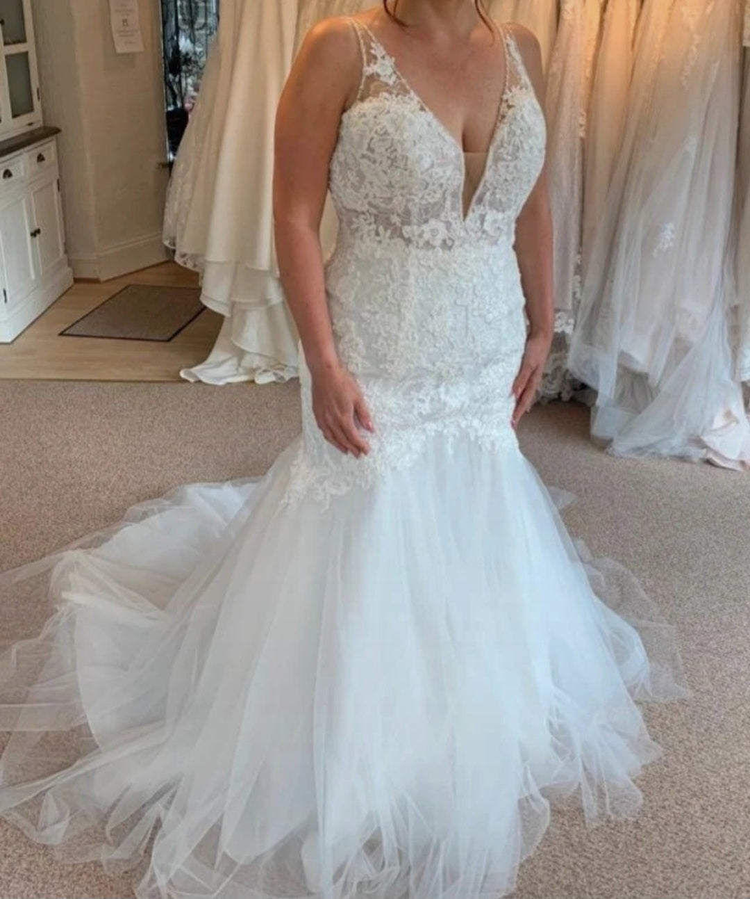 The style is mermaid fit and flare. This figure flattering dress is comprised of detailed lace motifs and a tulle skirt. Featuring a plunging illusion V-neckline, straps, and back, all trimmed with elaborate bead and sequin detail which creates a beautiful shimmer. Finished with covered buttons over zipper closure. This dress has never been worn or even tried on due to having ordering it but then needing to buy the same dress again in a bigger size. The photos are of me trying a sample dress.